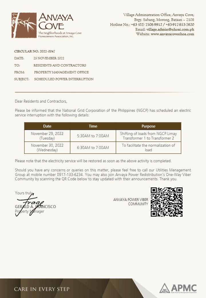 Nov 25 Circular 2022-0047 Scheduled Power Interruption Circular 2022-0047 Scheduled Power Interruption Previous Next