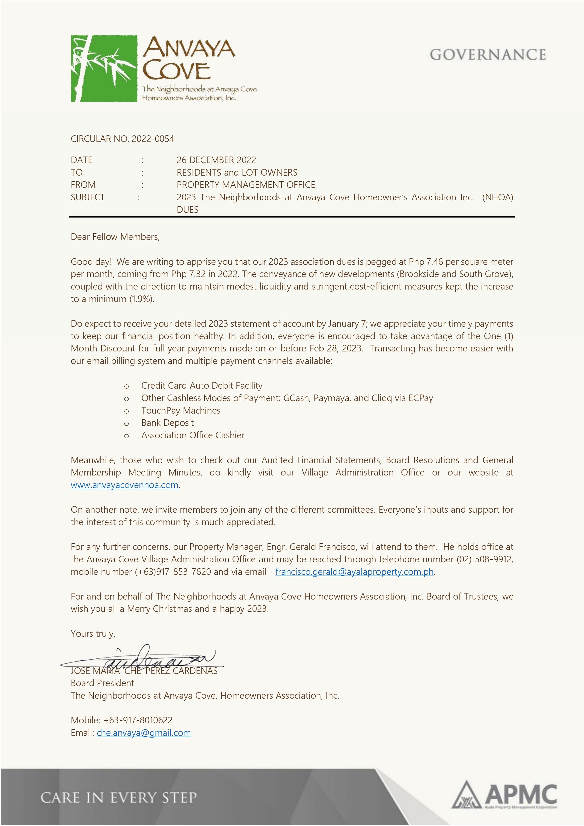 Circular 2022-0054 2023 The Neighborhoods at Anvaya Cove Homeowner’s Association Inc. (NHOA) DUES