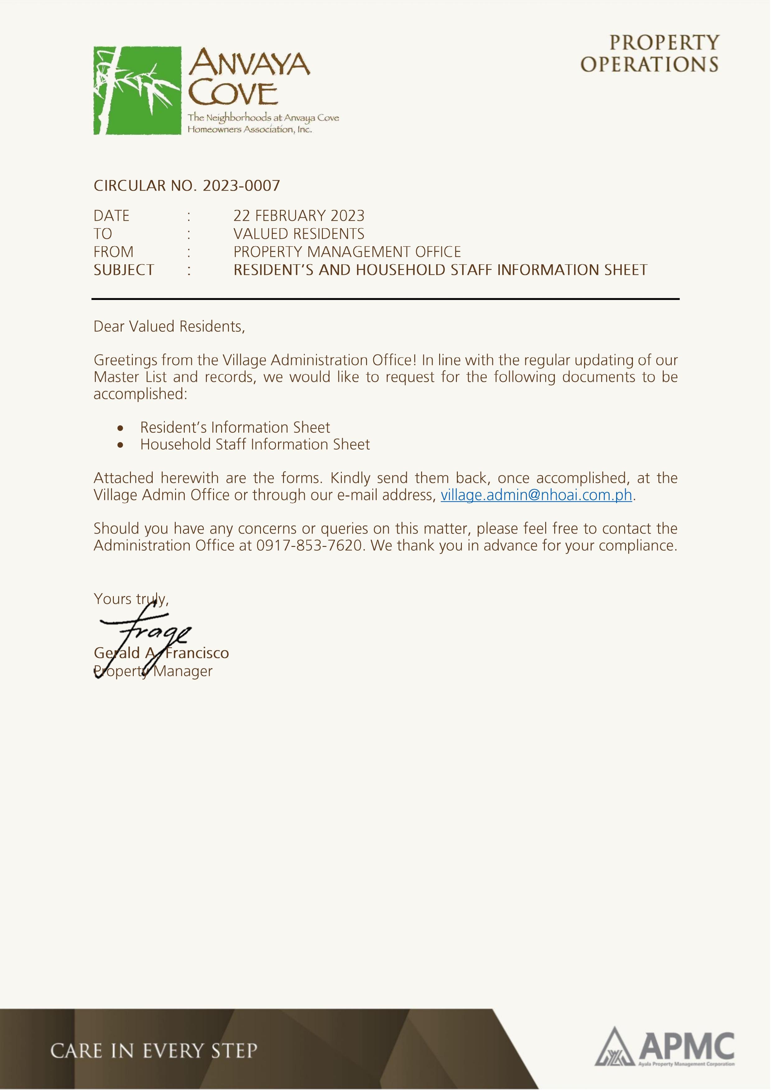 Circular 2023-0007 Resident’s and Household Staff Information Sheet