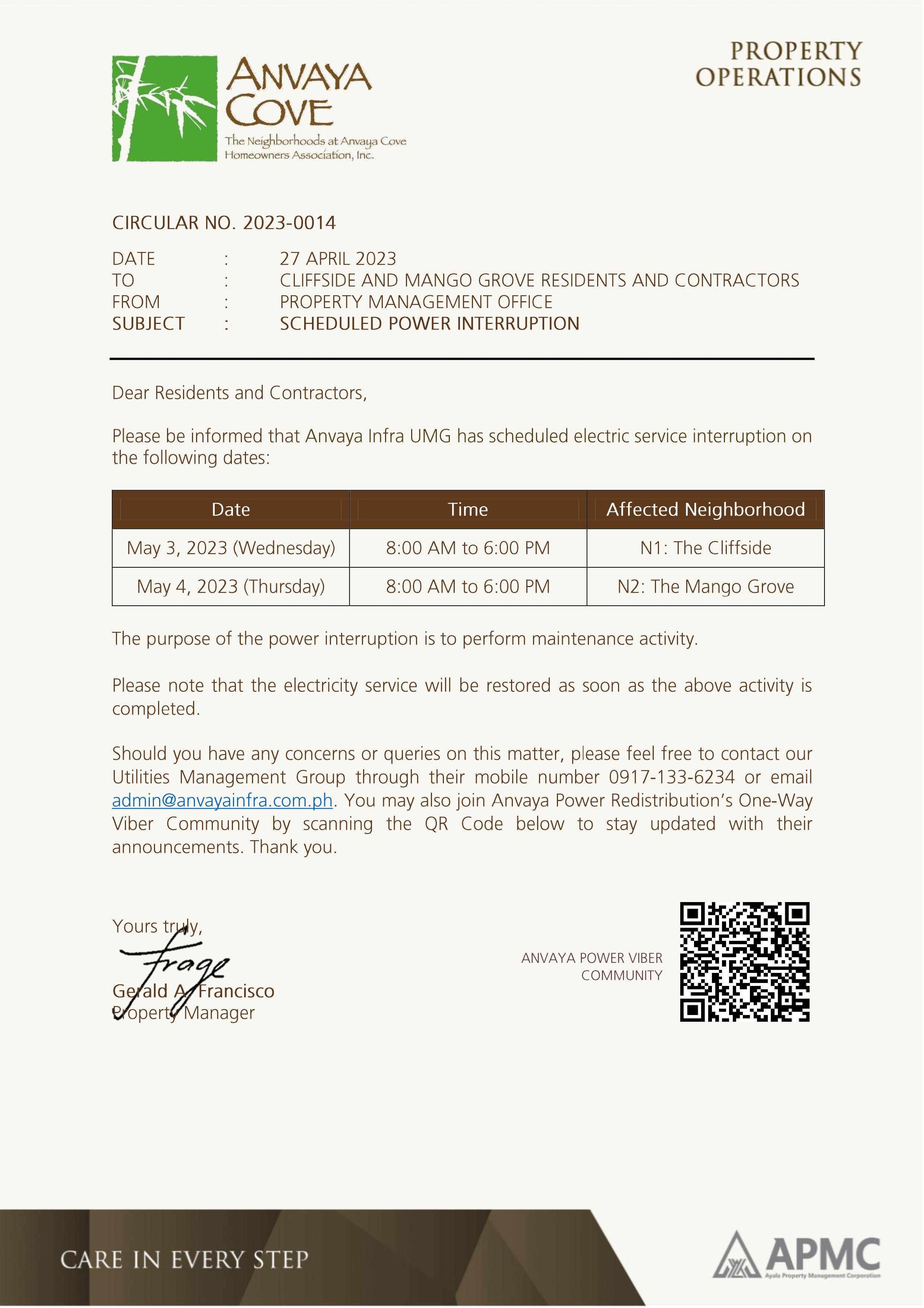 Apr 27 Circular 2023-0014 Scheduled Power Interruption Circular 2023-0014 Scheduled Power Interruption Previous Next