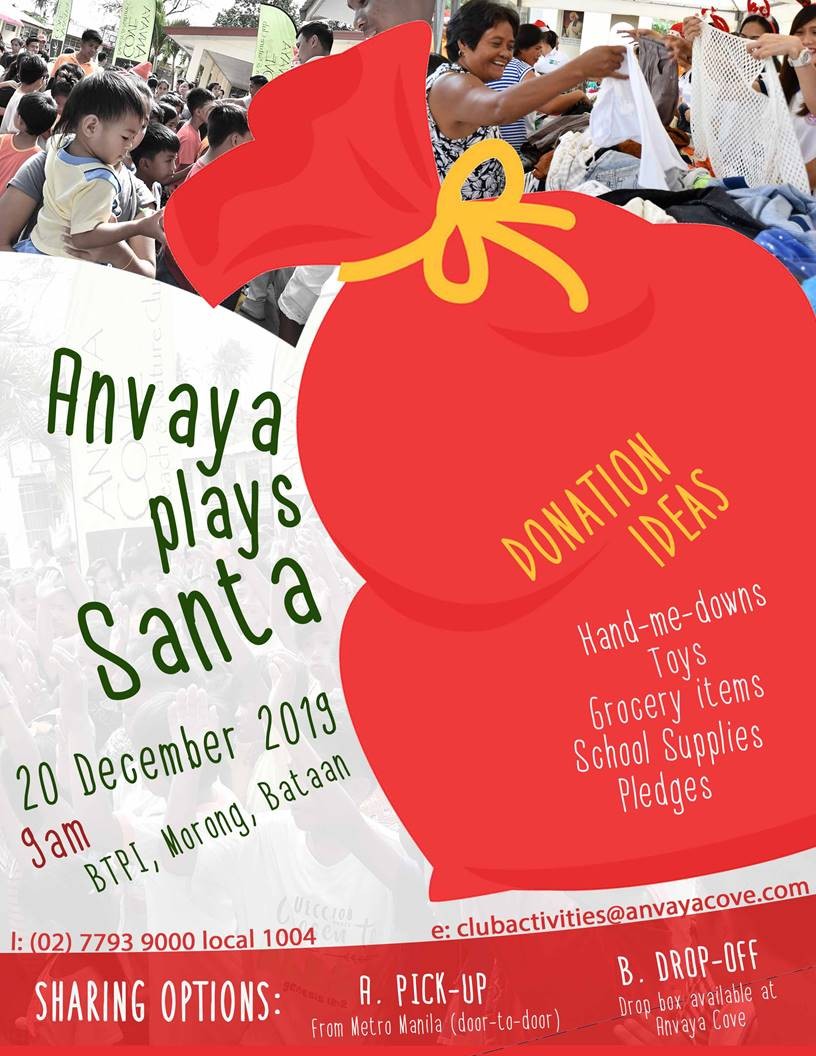 To facilitate pick-up of donations from your address, please contact the Recreation and Leisure Department at (02) 7793 9000 local 1004 or e-mail clubactivities@anvayacove.com. A drop box is also available at the Beach and Nature Club for drop-off of donations.