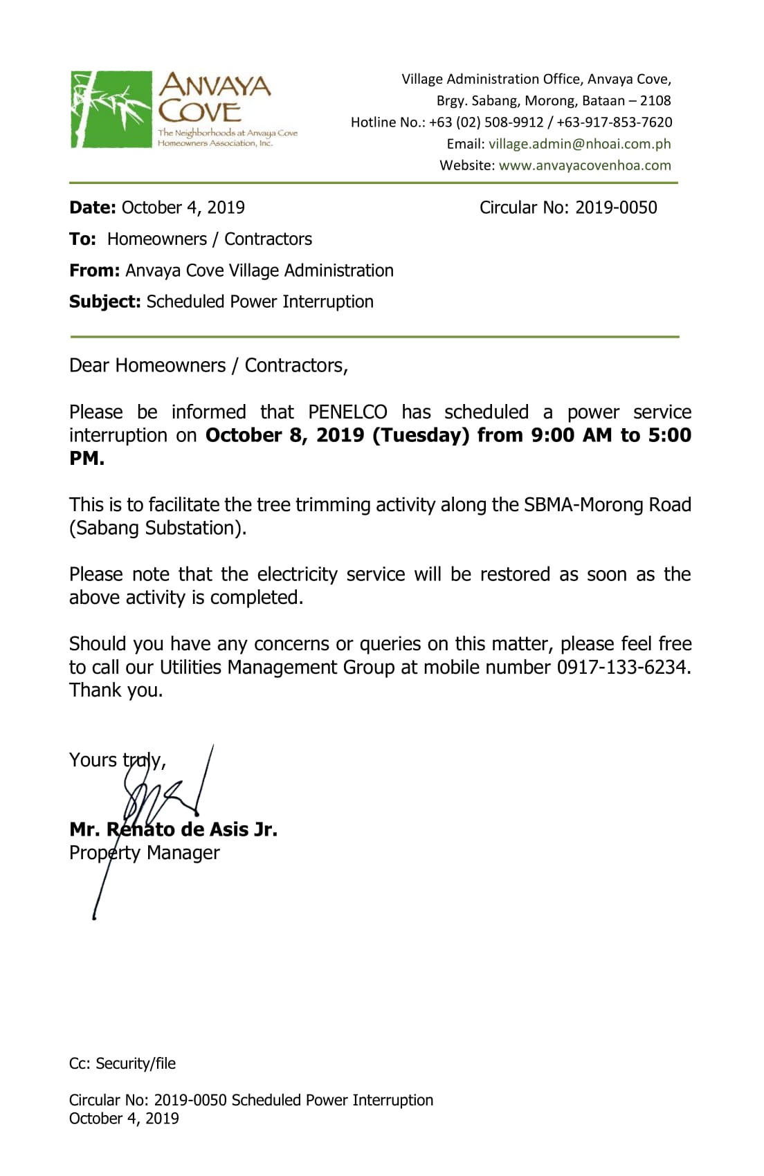 Oct 04 Circular 2019-0050 Scheduled Power Interruption SUBJECT: Scheduled Power Interruption Previous Next