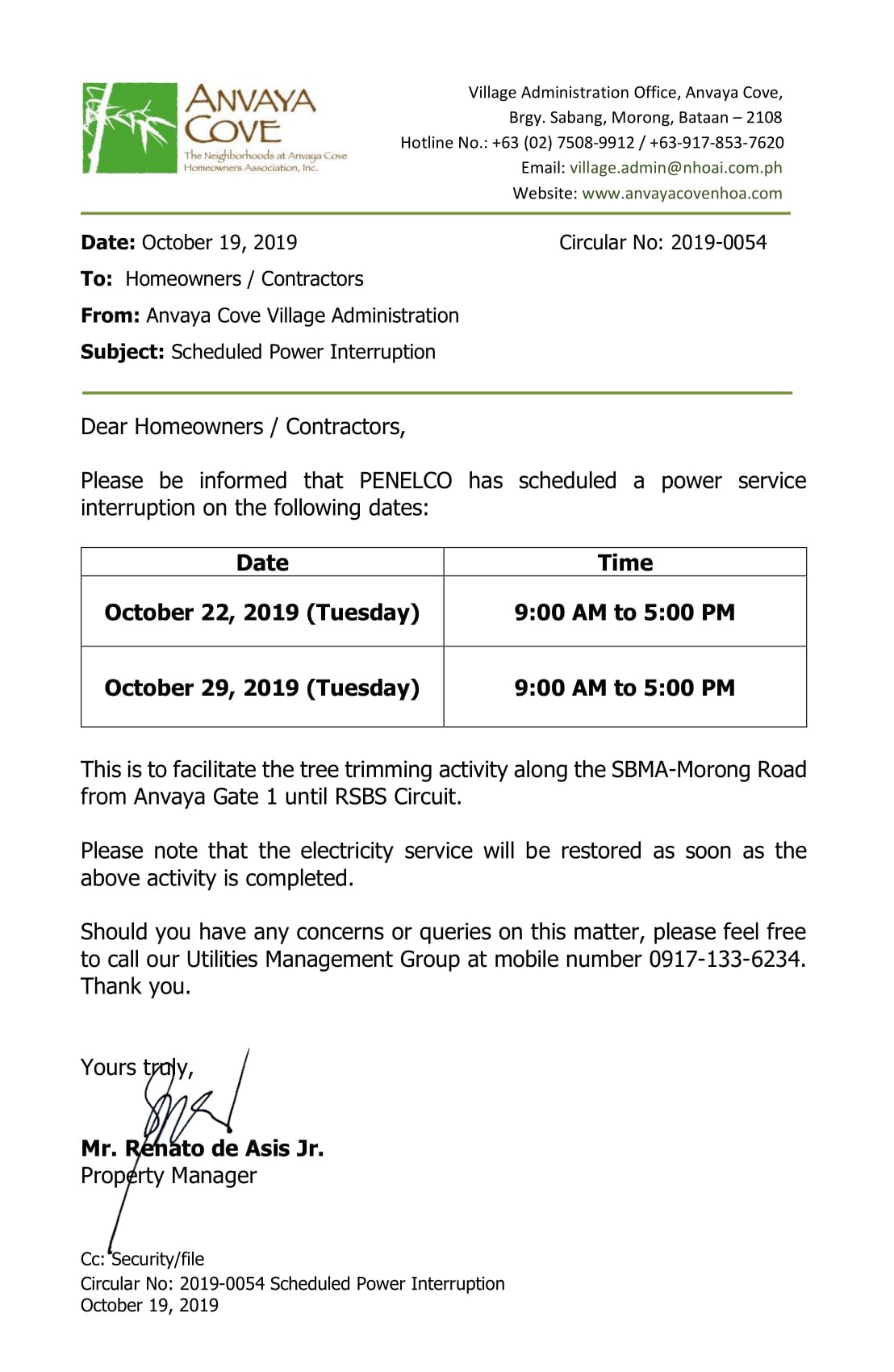 Oct 19 Circular 2019-0054 Scheduled Power Interruption SUBJECT: Scheduled Power Interruption Previous Next
