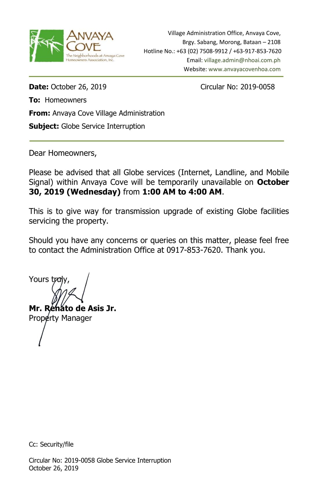 Oct 26 Circular 2019-0058 Globe Service Interruption SUBJECT: Globe Service Interruption Previous Next
