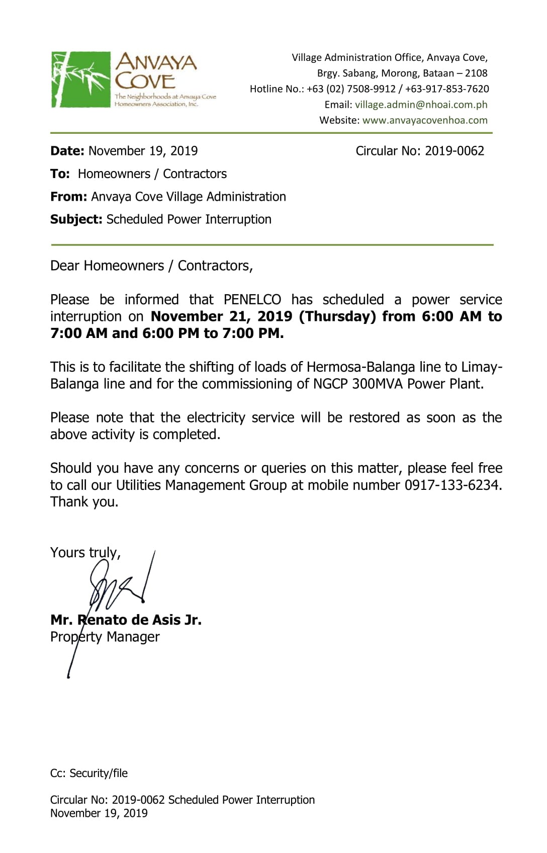 Nov 19 Circular 2019-0062 Scheduled Power Interruption SUBJECT: Scheduled Power Interruption Previous Next
