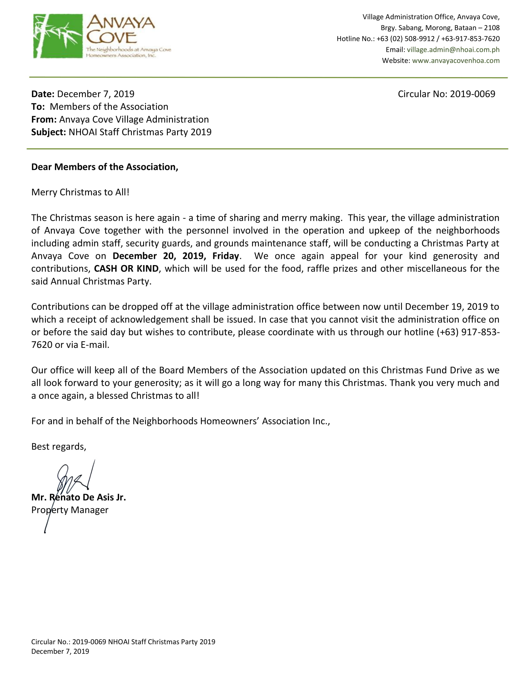 Dec 07 Circular 2019-0069 NHOAI Staff Christmas Party 2019 SUBJECT: NHOAI Staff Christmas Party 2019 Previous Next