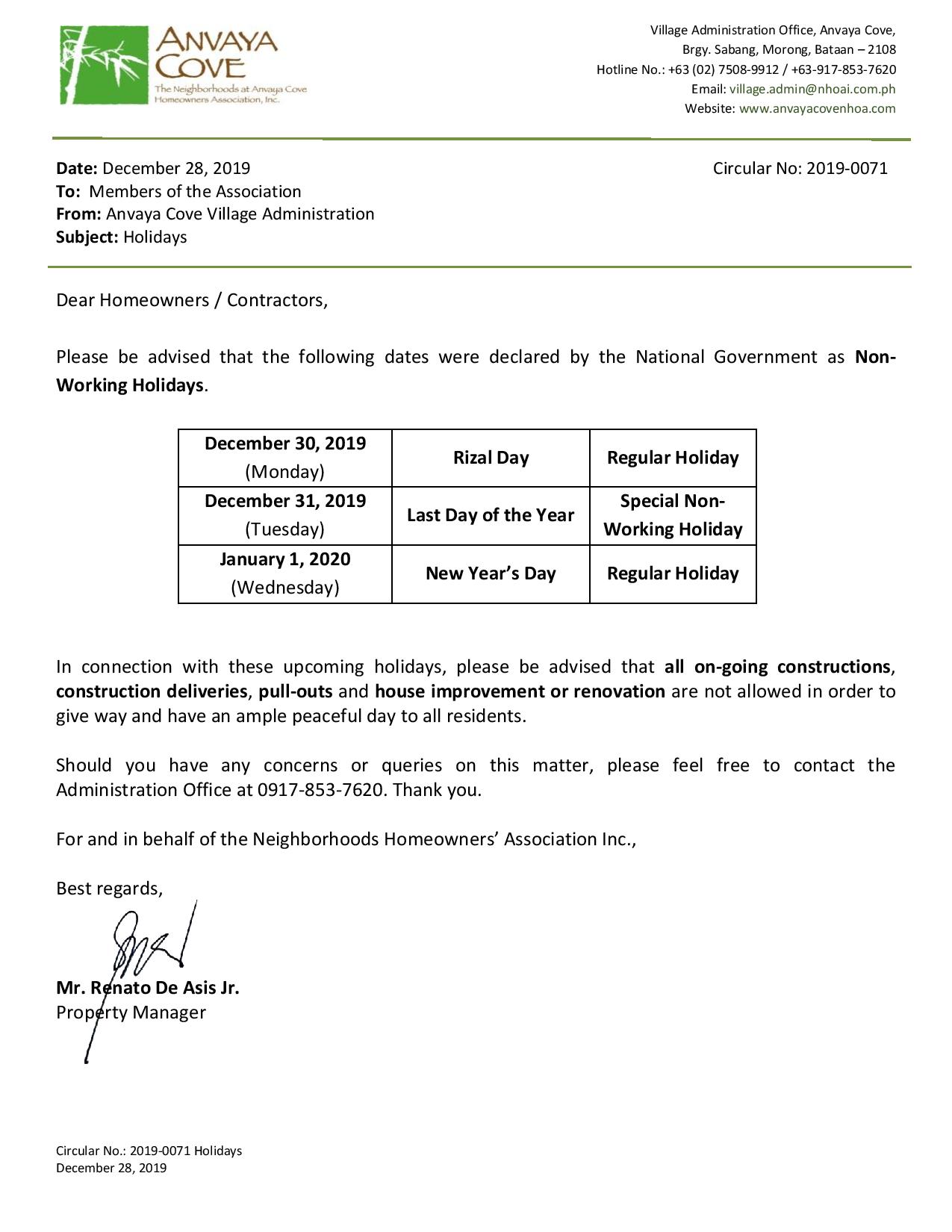 Circular 2026-0007 Holidays