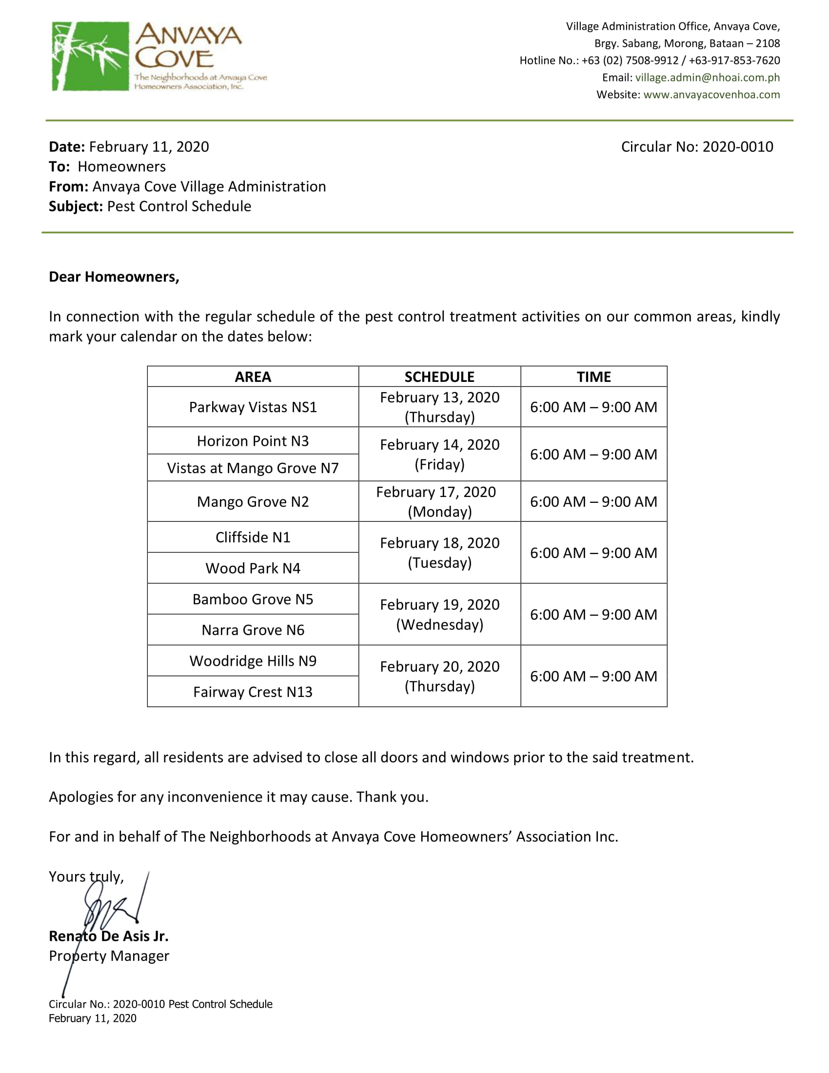 SUBJECT: Pest Control Schedule