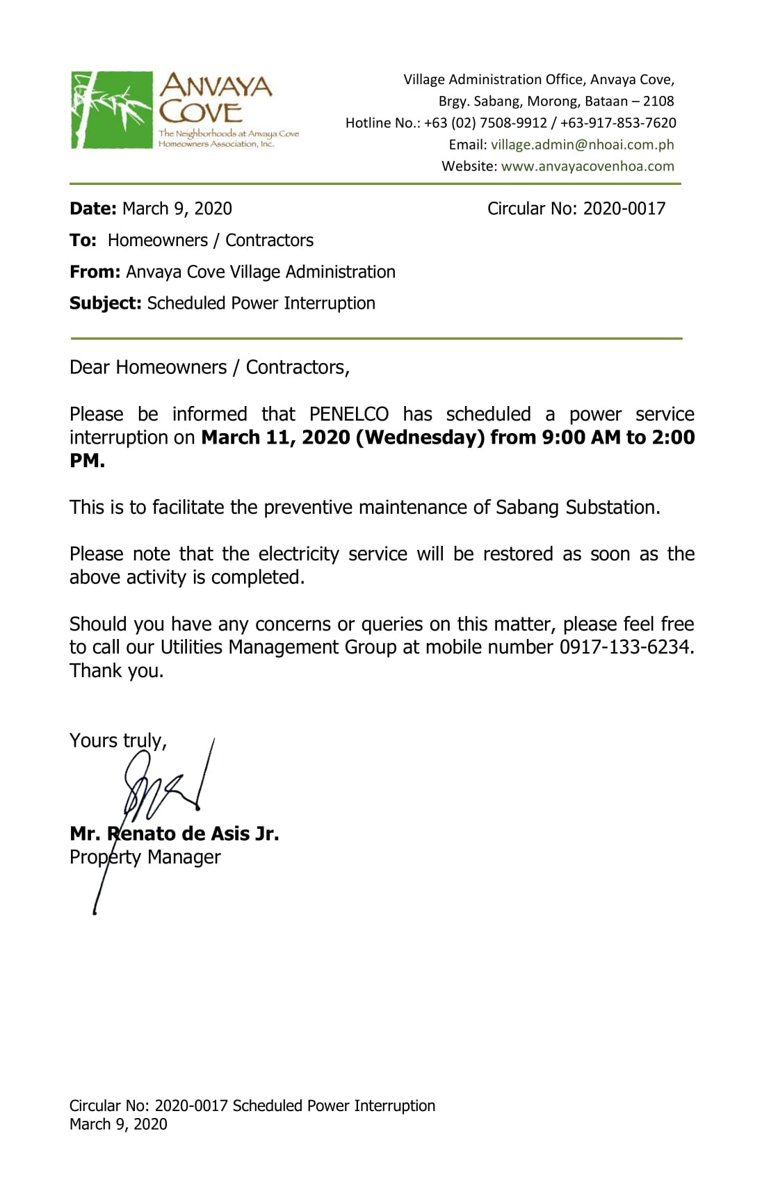 Mar 09 Circular 2020-0017 Scheduled Power Interruption SUBJECT: Scheduled Power Interruption Previous Next