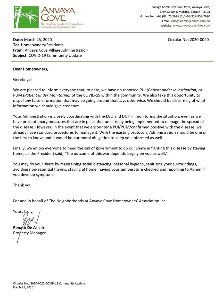SUBJECT: Circular 2020-0020 COVID-19 Community Update
