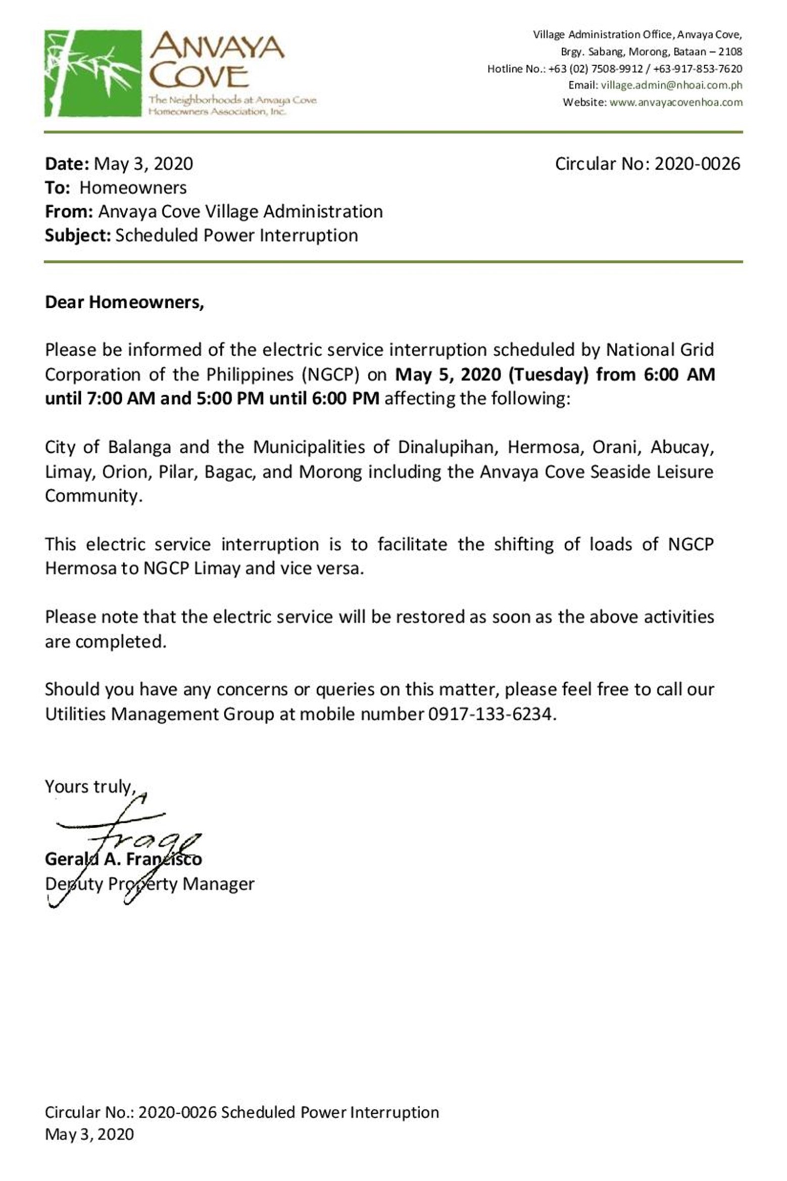 Circular 2020-0026 Scheduled Power Interruption